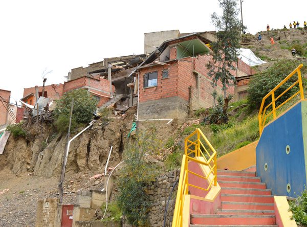 - La persistente lluvia que cayó la noche del lunes y la madrugada de ayer, en la ciudad de La Paz, dejó a ocho viviendas de la avenida Mecapaca, en la parte Sur de la ciudad, a punto de desplomarse.