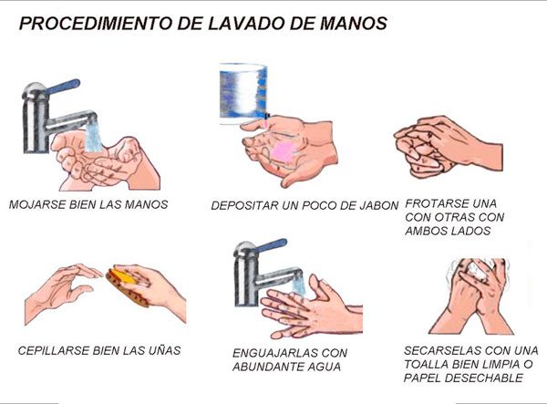 -Usar una técnica apropiada. Las manos húmedas se deben cubrir con jabón y frotar toda la superficie, incluidas las palmas, el dorso, entre los dedos y especialmente debajo de las uñas, por lo menos 20 segundos. Luego, se deben enjuagar bien con agua corriente y secarlas, ya sea con una tela limpia o agitando las manos.