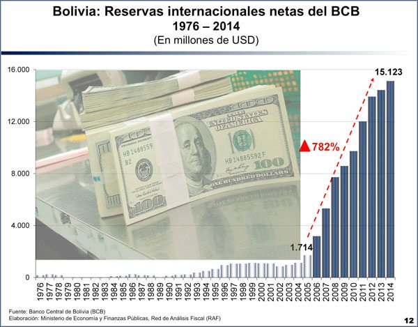 De acuerdo a los datos estadísticos del BCB, las reservas alcanzaban hasta fines de agosto de 2014, a $us 15.396 millones, pero al mes siguiente en septiembre, bajaron a $us 15.272 millones. Sin embargo, desde octubre de 2014 las cifras muestran una tendencia de crecimiento hasta noviembre al colocarse en $us 15.477 millones. En diciembre pasado volvieron a bajar hasta $us 15.123 millones en razón a los pagos efectuados por el Gobierno que indemnizó con $us 387 millones a la petrolera, Pan American Energy, (PAE) por la expropiación de sus acciones en la empresa Chaco. En enero de 2015 la cifra era de $us 15.087 millones hasta registrar $us 15.175 millones el 20 de febrero pasado.