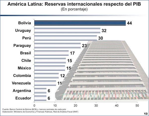 Los Bs 40.000 millones que puso a disposición el BCB para financiar a las empresas públicas, corresponden a casi el 40 por ciento de las reservas internacionales, que al 20 de febrero de la presente gestión alcanzan a $us 15.175 millones cerca –a su vez– del Producto Interno Bruto ($us 32.000 millones).