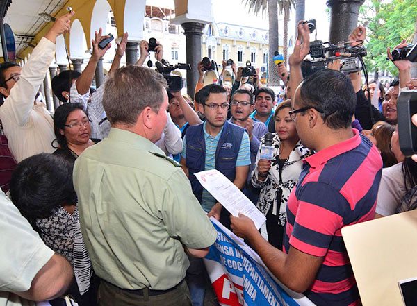 Las amenazas inscritas en la pared del domicilio del periodista José Miguel Manzaneda el reciente fin de semana, movilizaron a los trabajadores de la prensa en Cochabamba quienes se concentraron en la plaza principal 14 de Septiembre pidiendo garantías a las autoridades para el ejercicio de la profesión.