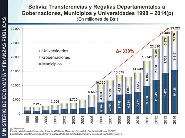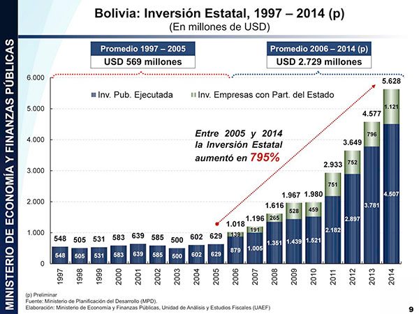 • El Gobierno anticipa problemas por caída de ingresos. Entre 2005 y 2014 la inversión estatal alcanzó anualmente un promedio de $us 2.729 millones. En ese mismo período el crecimiento acumulado fue 795 por ciento, según cifras del Ministerio de Economía. El nuevo presidente de la CEPB anunció el 9 de marzo que el sector privado invertirá este año $us 1.200 millones.