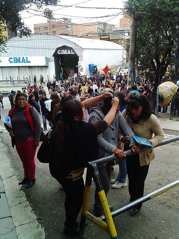 En medio de un ambiente tenso, los representantes de los padres de familia, desesperados y a gritos, pedían la agilización de documentos para la garantía de un buen desayuno escolar, también se escuchaba voces que pedían la renuncia del alcalde Rocha y voces de voto castigo para la anterior gestión edil.