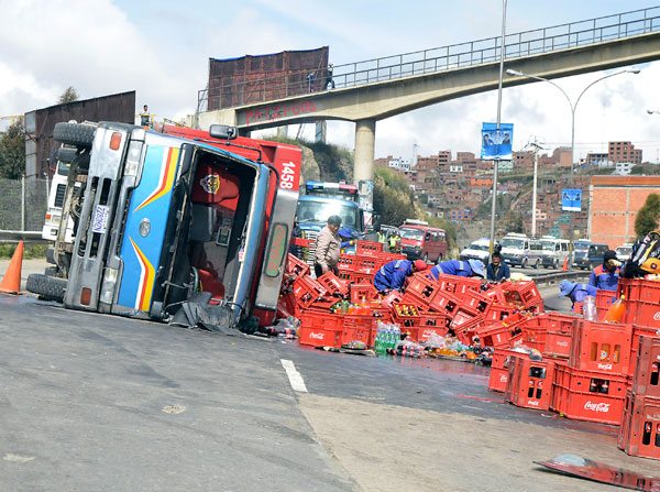 Un camión que transportaba gaseosas desde la urbe alteña hacia la sede de Gobierno, sufrió ayer un vuelco en la autopista que une ambas ciudades, lo que impidió el tráfico normal de vehículos.