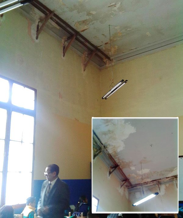 “Este problema es de hace tiempo, cuando llueve muy fuerte entra agua, entonces eso perjudica, para el normal desarrollo de las clases, porque los niños tienen que estar recorriendo y es todo un problema y eso han estado reclamando hace rato (...) internamente falta reparar mucho, por fuera hay un trabajo de maquillaje”, indicó el profesor René Sanjinés, con quien EL DIARIO aprovechó en hablar, mientras él dictaba clases a los estudiantes del curso Quinto “D”. Otro de los docentes dijo que es importante trabajar con urgencia los trabajos de mejora para el techo.