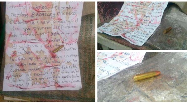 “Esta bala tiene el precio de tu cabeza, tiene tu nombre Escarley Pacheco. Lástima que ya no puedas investigar a nadie más en tu vida. Nunca debiste meter tus narices en la vida de los demás”, señala la carta de amenaza.