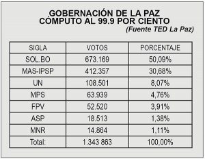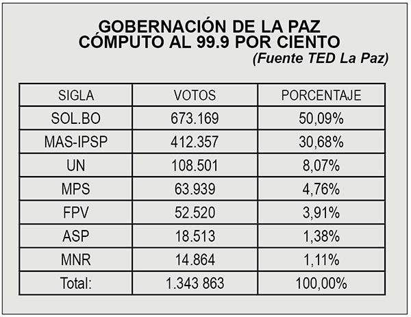 Hasta ayer, el Tribunal Electoral Departamental (TED) de La Paz debía presentar los datos finales del cómputo de las elecciones departamentales. El conteo oficial al 99.9 por ciento da como virtual ganador para la Gobernación a la agrupación ciudadana Soberanía y Libertad (Sol.bo) con 673.169 votos que representa el 50,09 por ciento de respaldo paceño.