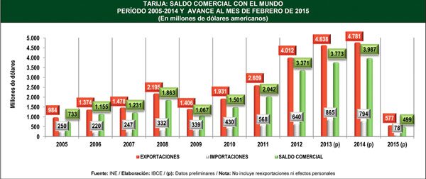 De acuerdo a una publicación del Instituto Boliviano de Comercio Exterior (IBCE), el departamento de Tarija exportó más de $us 25.000 millones en el período 2005-2014, mientras que las importaciones sumaron cerca de $us 5.000 millones, dejando un saldo comercial positivo de 21.000 millones.