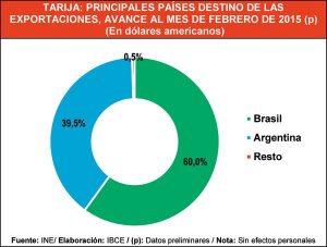 Las exportaciones del departamento de Tarija tuvieron como destino 12 países en el primer bimestre del 2015, Brasil y Argentina obtuvieron una participación del 99,5 por ciento del total.