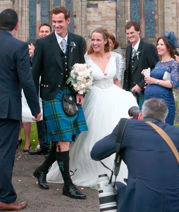 Fiel a la tradición de la región, Murray decidió que cada pequeño detalle de la ceremonia tuviera un marcado acento escocés. De esta manera, el joven de 27 años pasó por el altar vestido con el tradicional kilt, falda masculina típica de la zona, escogiendo para la ocasión un tejido tartán de cuadros azules y detalles en amarillo y verde. La novia, pintora de profesión e hija del estrenador de tenis Nigel Sears, fue mucho más convencional, decantándose por un vestido de gasa, cuello de pico e incrustaciones de pedrería combinado con un largo velo sujeto con una diadema.