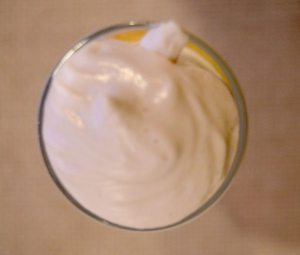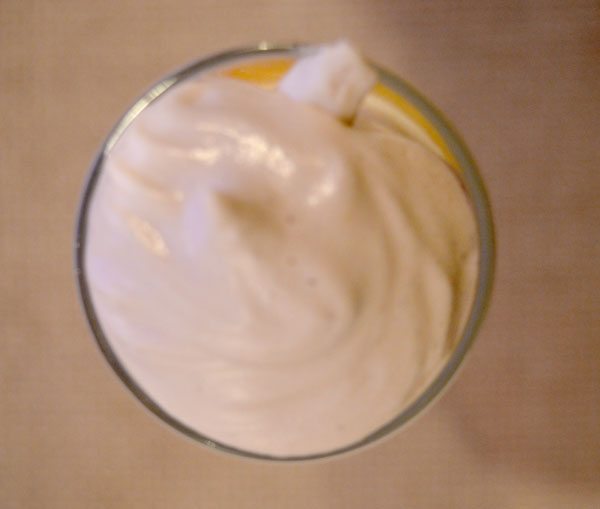 4.- Mezclar la crema de leche con la chirimoya y servir en una copa por capas. En la base vaciar una cucharilla de miel de café luego una parte de crema de chirimoya y así sucesivamente hasta llenar el vaso.