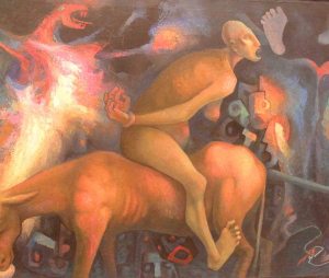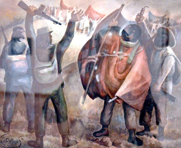 En los cuadros, leemos gráficamente el desplazamiento clandestino del pintor y acompañamos en silencio, a sus figuras en ademán contestatario, en gestos amenazantes, alentados por arengas que se adivinan en las bocas de hombres y mujeres.