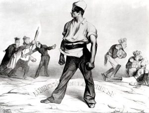 Otro genio, defensor de la justicia y de la población humilde, el gran pintor y caricaturista francés Honoré Daumier que, pese a su extrema pobreza fue acérrimo crítico, al satirizar gobiernos y pícaros que se dedicaban a la política. Puso énfasis en la libertad de prensa y de expresión. En 1832 fue encarcelado medio año por caricaturizar al poderoso Luis Felipe, cuyo rostro tomó la forma de una pera.