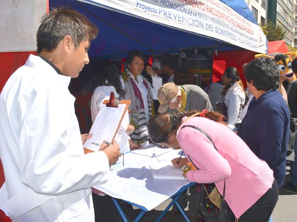 La Facultad de Medicina y la Carrera de Salud Pública de Universidad Mayor de San Andrés participaron ayer en la tradicional feria dominical del paseo El Prado, que es impulsada por el municipio paceño.