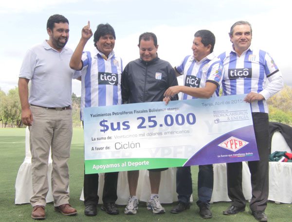 El presidente Evo Morales entregó 50 mil dólares a los equipos de Ciclón y Atlético Bermejo de Tarija como apoyo para que puedan lograr el ascenso de categoría a la Liga del Fútbol Profesional Boliviano.