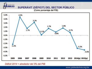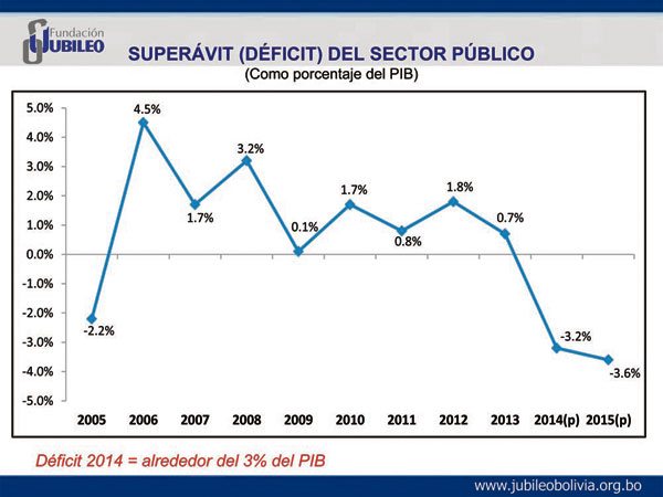 Mientras la Fundación Jubileo recomendó al Gobierno evitar el crecimiento de los gastos corrientes (salarios), el exministro de Finanzas, David Blanco, señaló que lo primero que debiera hacer el Ejecutivo es revertir el déficit fiscal de 3.2 por ciento con el que cerró la economía en 2014. Pero más al contrario, este año aumentará el déficit a 4.1 por ciento (ajustado) como proporción del Producto Interno Bruto, situación que no se registró en los últimos ocho años de gestión. El investigador de Jubileo, René Martínez, sostuvo que inexplicablemente el Gobierno incurrió en 2014 en déficit cuando el año pasado aún no se había advertido la baja de los precios básicos en el mercado internacional.