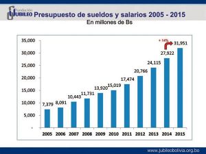 De un presupuesto de 7.379 millones de bolivianos destinados para el pago de sueldos el año 2005, este año se destinarán para ese mismo fin 31.951 millones de bolivianos.