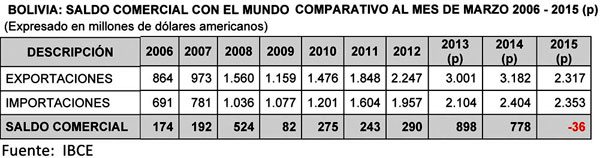 Las ventas externas de Bolivia al mes de marzo de 2015 llegaron a 2.317 millones de dólares, experimentando una sensible baja de 886 millones comparativamente al primer trimestre de 2014, producto de la caída de los siguientes sectores: hidrocarburos (-507 millones de dólares); industria manufacturera (-298 millones de dólares); minerales (-63 millones de dólares) y agricultura (-40 millones de dólares).