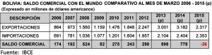 Un informe del Instituto Boliviano de Comercio Exterior (IBCE) explica que las importaciones de Bolivia hasta marzo de 2015 llegaron a 2.353 millones de dólares, experimentando una pequeña baja de 53 millones comparadas al primer trimestre de 2014. El desempeño de los principales rubros de importación fue el siguiente: a) Por el lado de los que disminuyeron su valor: bienes de capital bajó en 58 millones de dólares; combustibles y lubricantes, disminuyó en 56 millones de dólares); alimentos y bebidas cayó en 39 millones de dólares; b) Los que subieron su valor fueron: suministros industriales, que aumentaron en 23 millones de dólares; equipos de transporte que subieron en 61 millones y artículos de consumo que aumentaron en 15 millones.