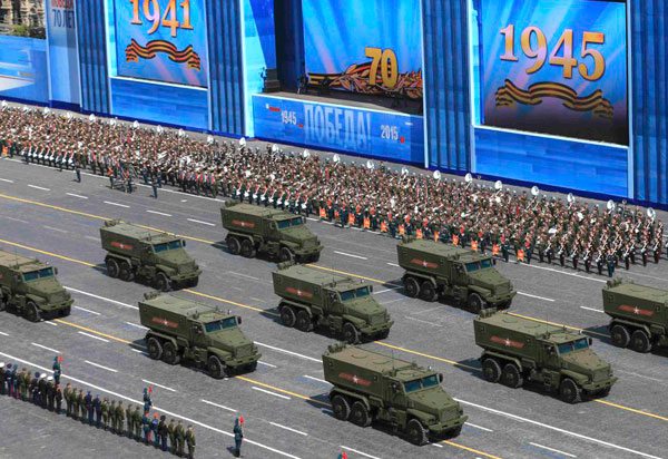 Ante el Kremlin desfilaron cerca de 16.000 uniformados, parte de ellos en trajes de época, y también el armamento más moderno del Ejército ruso, como el tanque T-14 Armata, los misiles balísticos RS-24 Yars, que pueden llevar tres cabezas nucleares, y el complejo de misiles antiaéreos Pantsir. Más de 140 aviones cruzaron el cielo despejado de Moscú y por segundo año consecutivo, en el desfile participaron unidades militares de la anexionada Crimea. En total, en las celebraciones del Día de la Victoria han participado 12 millones de personas.