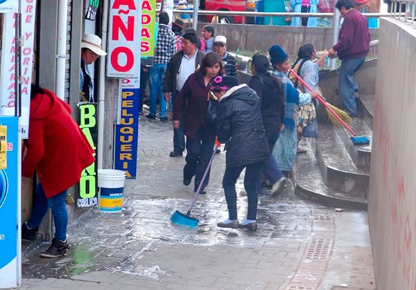 Esta dependencia edil desplegó a 12 funcionarios, nueve para el lavado de los puestos de venta y tres para el fumigado.