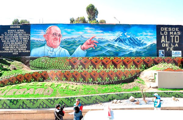 El Municipio de El Alto, a través de su programa Ceja Nuevo Centro Urbano “Nayra Punku”, presentó el primer mural dedicado al papa Francisco, quien llegará al país el 8 de julio.