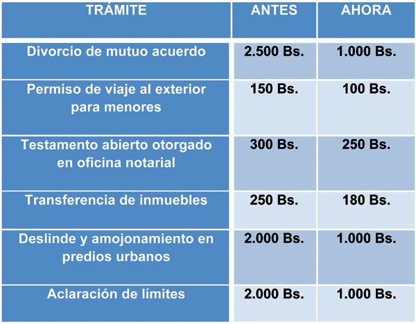 De acuerdo a una resolución emitida desde el Ministerio de Justicia, los aranceles por el pago de trámites y servicios prestados por los notarios deben rebajar entre 30 a 50 por ciento. Con la nueva escala de precios, por ejemplo, el costo por el trámite de un divorcio disminuirá de 2.500 a 1.000 bolivianos.