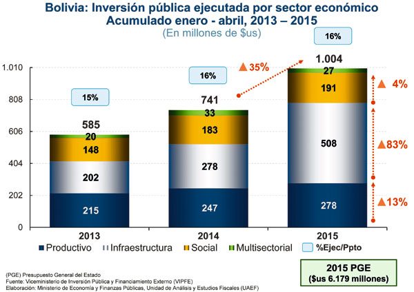 Al concluir el primer cuatrimestre del año, la inversión pública ejecutada llegó a $us 1.004 millones de los $us 6.179 millones que se tiene presupuestado ejecutar este año. Esa cifra representa solo 13 por ciento de las metas sestablecidas para este año. El presidente Evo Morales señaló que la cifra llegaría a $us 7.300 al concluir la gestión. La cifra invertida hasta abril es 35% más de lo que se ejecutó en similar período de 2014 señala un reporte del Ministerio de Economía.