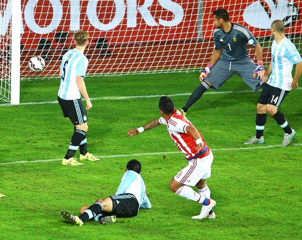El juez colombiano Wilmar Roldán pitó penalti, tras falta sobre Di María, ‘la Pulga’ definió por lo seguro, con un remate ajustado al poste derecho de Antony Silva (36’). En el complemento, en una desconcentración en la medular Javier Pastore erró en el pase, y Néstor Ortigoza sirvió a Haedo Valdez, quien a unos 20 metros de la portería sorprendió, para el 2-1. La albiceleste perdió el control del centro del campo y concedió dos buenas oportunidades a los paraguayos, una de ellas neutralizada por un corte oportuno de Mascherano.