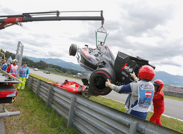El español Fernando Alonso (McLaren), doble campeón del mundo de Fórmula Uno, que abandonó el Gran Premio de Austria tras chocar con el Ferrari de Kimi Raikkonen, explicó que “todo está bien”, que el monoplaza del finés “patinaba” desde la segunda curva, que finalmente “perdió el control” y que ambos se fueron “contra el muro”. “Está todo bien, fui al centro médico porque saltó la alarma del coche, creo que marcaba 34 G’s (34 puntos de ‘fuerza G’, una medida de aceleración basada en el incremento de velocidad a causa de la gravedad), pero todo está bien”, explicó Alonso -ganador de 32 Grandes Premios y que ayer abandonó por cuarta vez seguida este año- al canal de televisión Antena 3 en Spielberg (Austria).