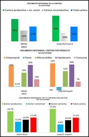 A mayo de 2015, la banca continuó impulsando el crédito productivo y de vivienda de interés social, cumpliendo su misión de respaldar al sector productivo y a las familias bolivianas, sin embargo, los recursos totales acusaron un menor crecimiento. Un documento de la Asociación de Bancos Privados (Asoban) explica que “la cartera de préstamos total creció a menor ritmo, situación que responde a los resultados de la cartera no productiva”.