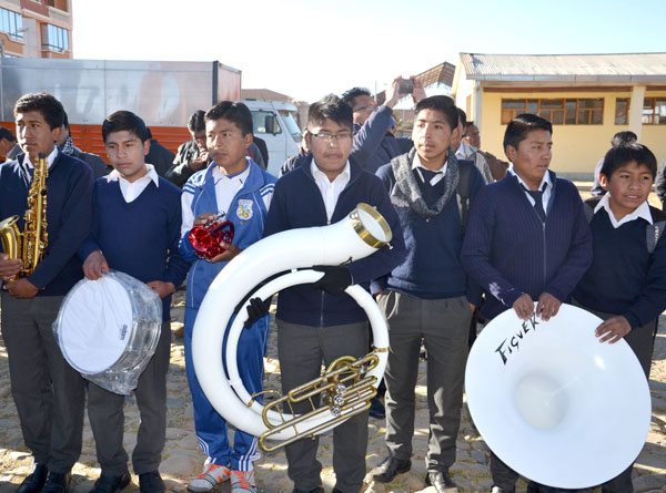 La alcaldesa de la ciudad de El Alto, Soledad Chapetón, entregó ayer 643 instrumentos musicales a estudiantes de 14 unidades educativas.