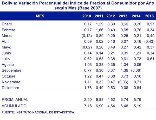 La inflación hasta finales de gestión fue fijada por el gobierno de 5%. Los indicadores del Instituto Nacional de Estadística (INE) no muestran incrementos significativos, con excepción de julio, que fue el más alto de los últimos siete meses. Los datos muestran que en el último quinquenio, 2010- 2014, el séptimo mes del año es el más inflacionario.