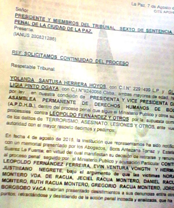 Una nota firmada por la presidenta de la APDHB, Yolanda Herrera, y la vicepresidenta, Ligia Pinto, ingresó ayer al Tribunal Sexto de Sentencia en lo Penal de La Paz con referencia: “Solicitamos la continuidad del proceso” en contra de Leopoldo Fernández, por la supuesta comisión de los delitos de terrorismo, asesinato, lesiones y otros. Una vez más, aseguraron que los juristas dependientes de esa institución, actuaron de manera personal cuando presentaron un memorial para desistir acusaciones contra la exautoridad pandina.