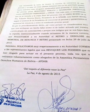 El 29 de julio, los abogados apoderados de la institución, Boris Antezana y Estefanía Suárez la Fuente, retiraron la acusación en el caso, posteriormente, la presidenta de la APDHB, Yolanda Herrera, acusó a los juristas de haber presentado el desistimiento sin la autorización del directorio que regenta. La versión fue desmentida a través de un memorial que fue entregado al Tribunal Sexto de Sentencia el 4 de agosto.