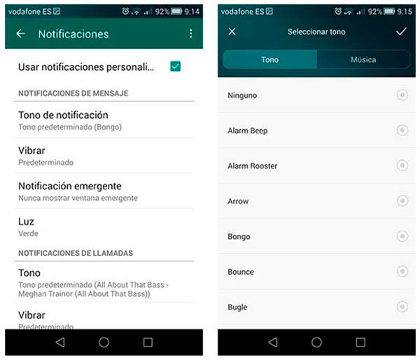 También en este mismo menú es posible establecer las notificaciones personalizadas para las llamadas de WhatsApp. Concretamente, para escoger la melodía que sonará cuando dicho usuario llame a través del servicio de la aplicación, así como el tipo de vibración.