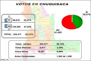 Según datos de la página oficial del TSE que publicó la finalización del cómputo de actas del referéndum autonómico de Chuquisaca, ganó el “No” con un 57,43 por ciento sobre el Sí que obtuvo un 42,57 por ciento.