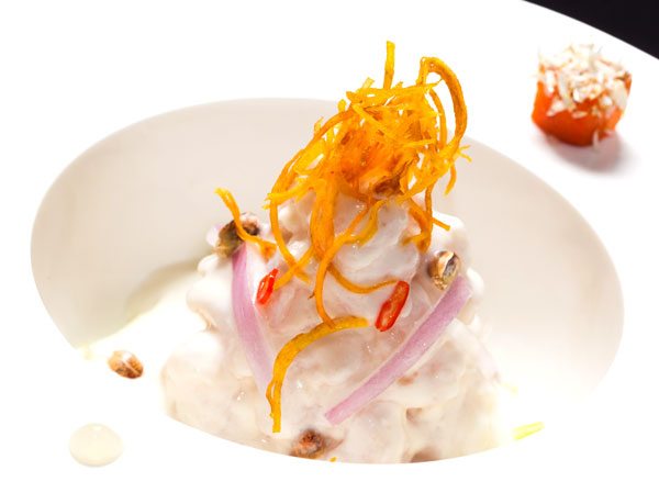 Agregar la leche de tigre al pescado junto con la reducción de coco y sazonar a gusto.