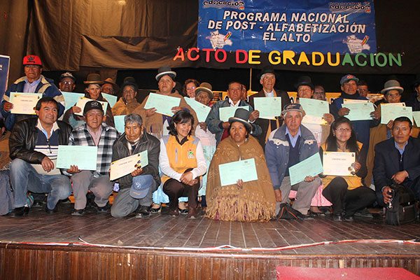El acto de graduación estuvo presidido por el director General de Post-alfabetización, Ramiro Tolaba, quien precisó que el número de graduados del Programa Nacional de Post-alfabetización en el Municipio de El Alto es de 785, de los cuales 63 lograron aprender a leer y escribir, 61 concluyeron el tercero de primaria y 661 el sexto de primaria.