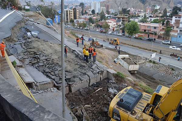 La plataforma de la avenida Los Álamos, en el sector de ingreso a Alto La Florida, en el macrodistrito Sur, se deslizó 40 metros, generando el destrozo total de aceras, cunetas y postes. Las causas de este hecho aún son analizadas, según información del secretario municipal de Gestión Integral de Riesgos, Vladimir Toro.