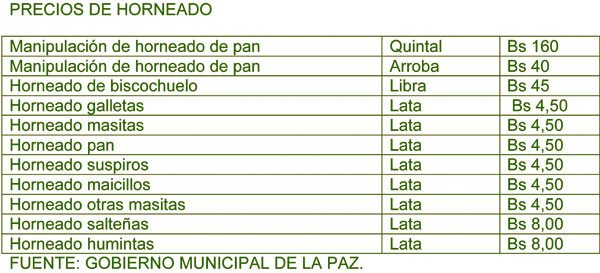 Mientras que en El Alto la Intendencia Municipal a cargo de Elías Villa informó que de acuerdo a una reunión con el sector de panificadores, el horneado, por quintal de harina costará 140 bolivianos, el medio quintal 72,50 y en el caso de bizcochuelos el costo acordado es de 55 bolivianos. Mientras que la lata de horneado de galletas, masitas, pan suspiros y maicillos el precio de lata es de 5,50 bolivianos.