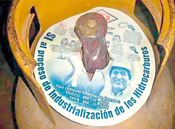 El legislador opositor mostró imágenes de garrafas de GLP, las que en su parte superior una etiqueta circular impresa con tonos azules y celestes con la cara del presidente Evo Morales y una imagen de los tanques de almacenamiento de carburantes de YPFB y alrededor de esa imagen compuesta la leyenda: “Sí al proceso de industrialización de los Hidrocarburos”. En la etiqueta también están impresos los números gratuitos de teléfonos de Odeco y de YPFB “para cualquier información”. No especifica si es para la información de la campaña o de la garrafa.