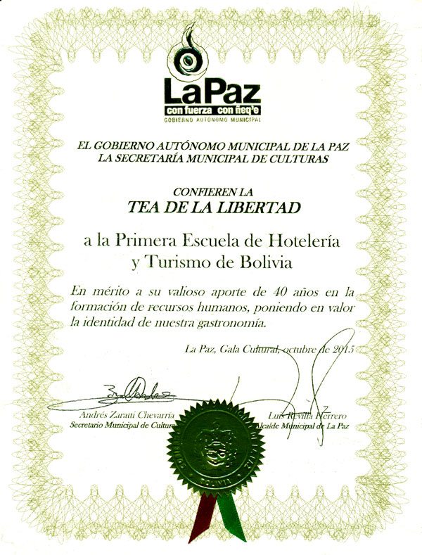 El evento de premiación denominado La Gala Cultural de Octubre, se efectuó el miércoles 21 del presente mes, en el Teatro Municipal “Alberto Saavedra Pérez”, organizado por el Gobierno Autónomo Municipal de La Paz, a través de su Secretaría Municipal de Culturas. Durante esta conmemoración se galardonó a destacados personajes del quehacer cultural y educativo de la ciudad de La Paz, entre ellos a la Primera Escuela de Hotelería y Turismo de Bolivia en reconocimiento a su valioso aporte de 40 años en la formación de recursos humanos que ponen en valor la identidad de nuestra gastronomía, se le hizo entrega de La Tea de La Libertad en el Grado al Mérito.