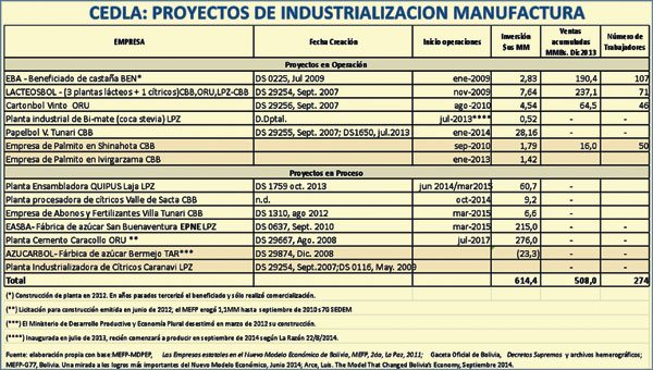 El Gobierno posee empresas de miel en el Chaco y en los Yungas; también Lácteosbol; Cartonbol, que está en Oruro, con cuatro años de operaciones y Papelbol, que está en miras de sellar un acuerdo con una empresa privada de Santa Cruz para producir cuadernos.