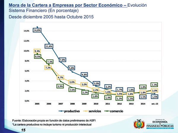 El Ministerio de Economía informó que el sector comercio presenta la mora más alta del sistema bancario de los últimos seis años y que hasta octubre de 2015 llegó a 2,3%. En tanto el financiamiento para fines productivos, que tiene tasas reguladas, el promedio es 1.5 por ciento, según el viceministro de Pensiones y Servicios Financieros, Mario Guillén.