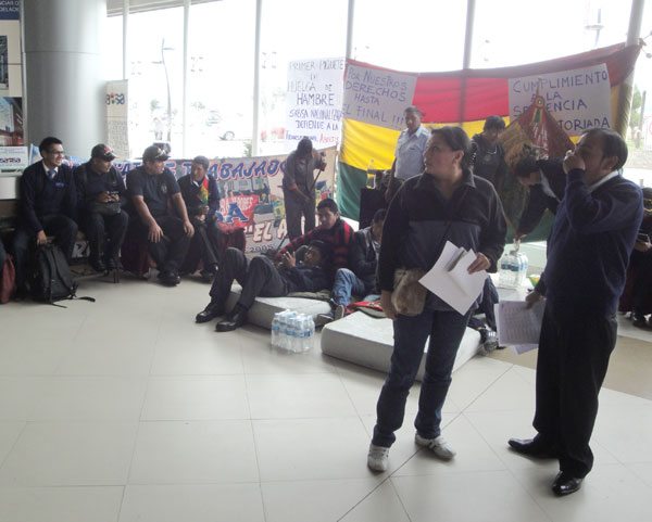 Rodeados por una bandera tricolor y varios carteles que fueron pegados a los ventanales, los cuatro huelguistas se encontraron ayer rodeados por sus compañeros de diferentes unidades del Aeropuerto Internacional de El Alto.