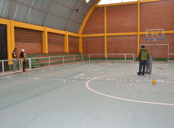 Consta de piso de goma de cuatro milímetros de espesor, arcos, graderías con butacas, tableros de vidrio templado y la demarcación con líneas separadoras para las diferentes disciplinas deportivas.