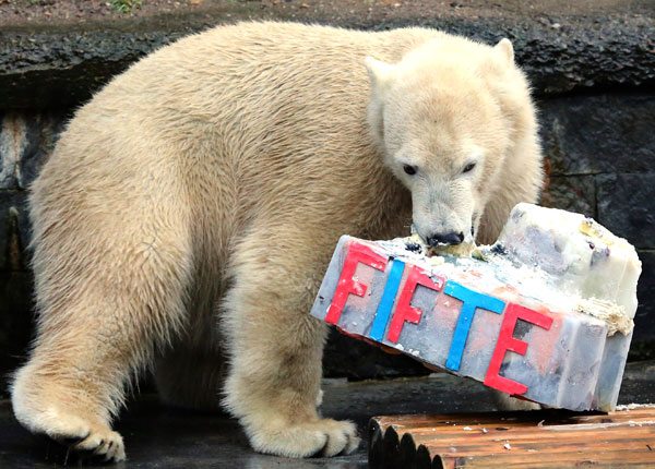 “Fiete”, un oso polar, disfruta de la torta helada de puré de papas y salmón que le han regalado por su primer cumpleaños en el zoológico de Rostock (Alemania), el 3 de diciembre 2015.