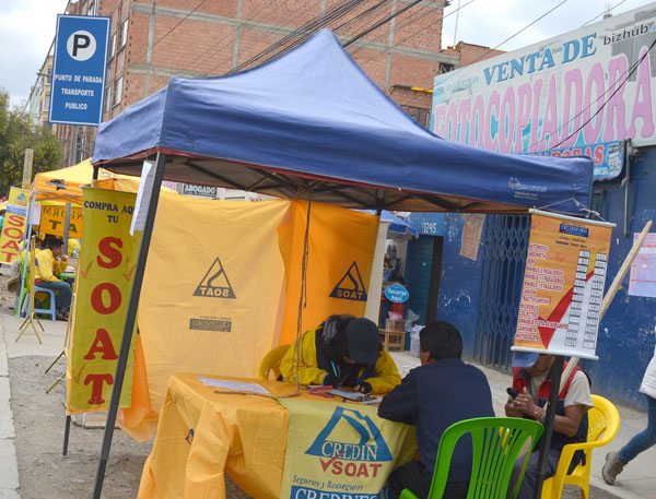 Como cada año en esta época, los puntos de venta del Seguro Obligatorio contra Accidentes de Tránsito (SOAT) se instalan en las calles más transitadas de la ciudad ofreciendo el producto tanto a conductores del servicio público como del privado.