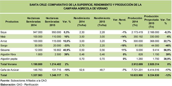 - La superficie cultivada en la campaña de invierno 2015, registra un leve incremento de 2% (20 mil hectáreas) más en comparación con la campaña de invierno 2014, donde se logró cultivar 905.000 hectárea. Los principales cultivos que registraron aumento en la superficie cultivada son: girasol un 49%, trigo 30% y sorgo 9%; el cultivo de soya no registra variaciones en la superficie sembrada mientras que los cultivos que disminuyeron las hectáreas sembradas son, la chía 76% y el maíz un 33%.